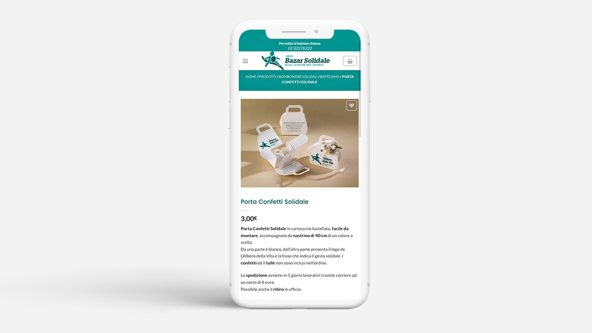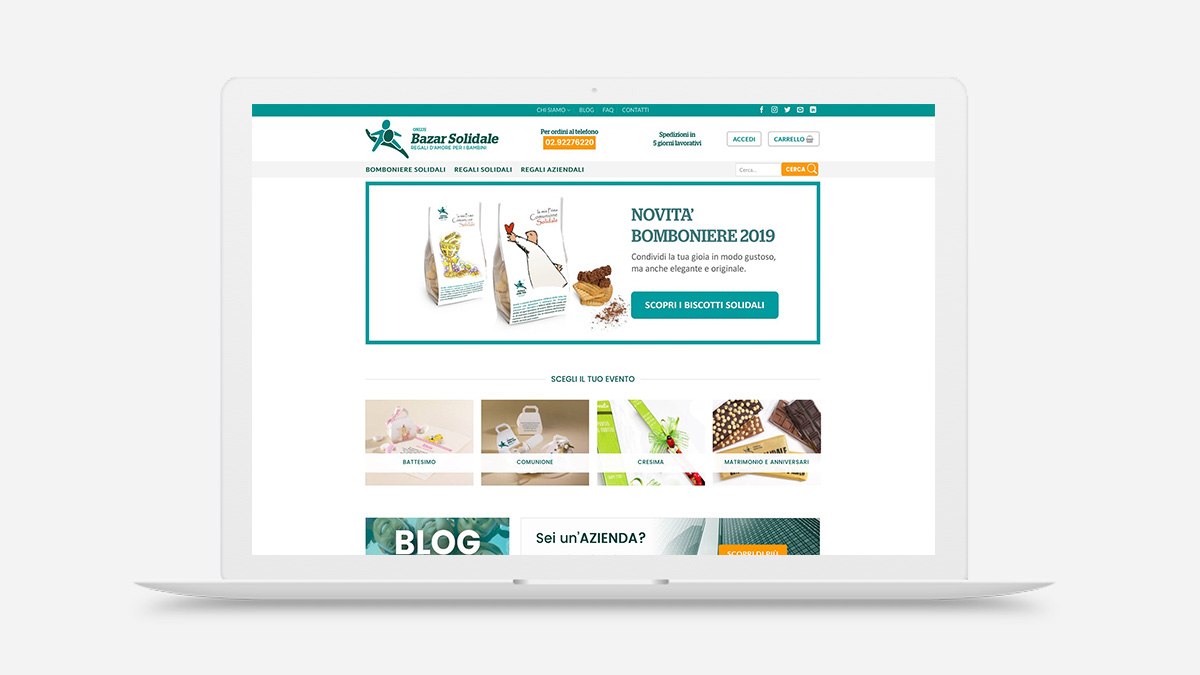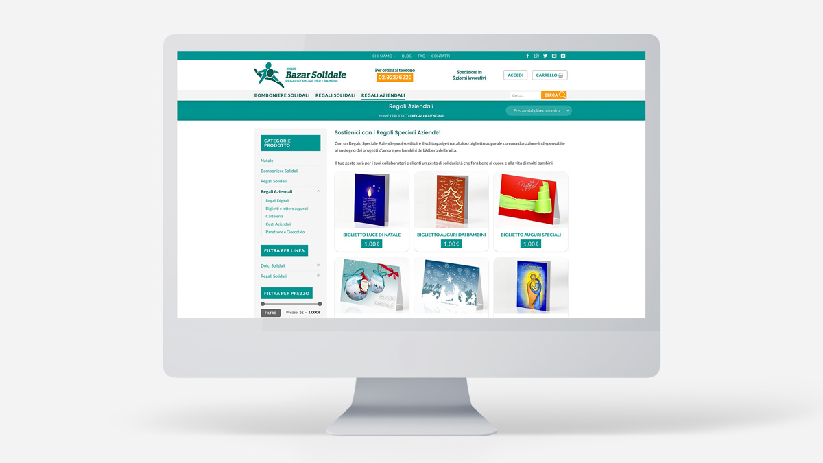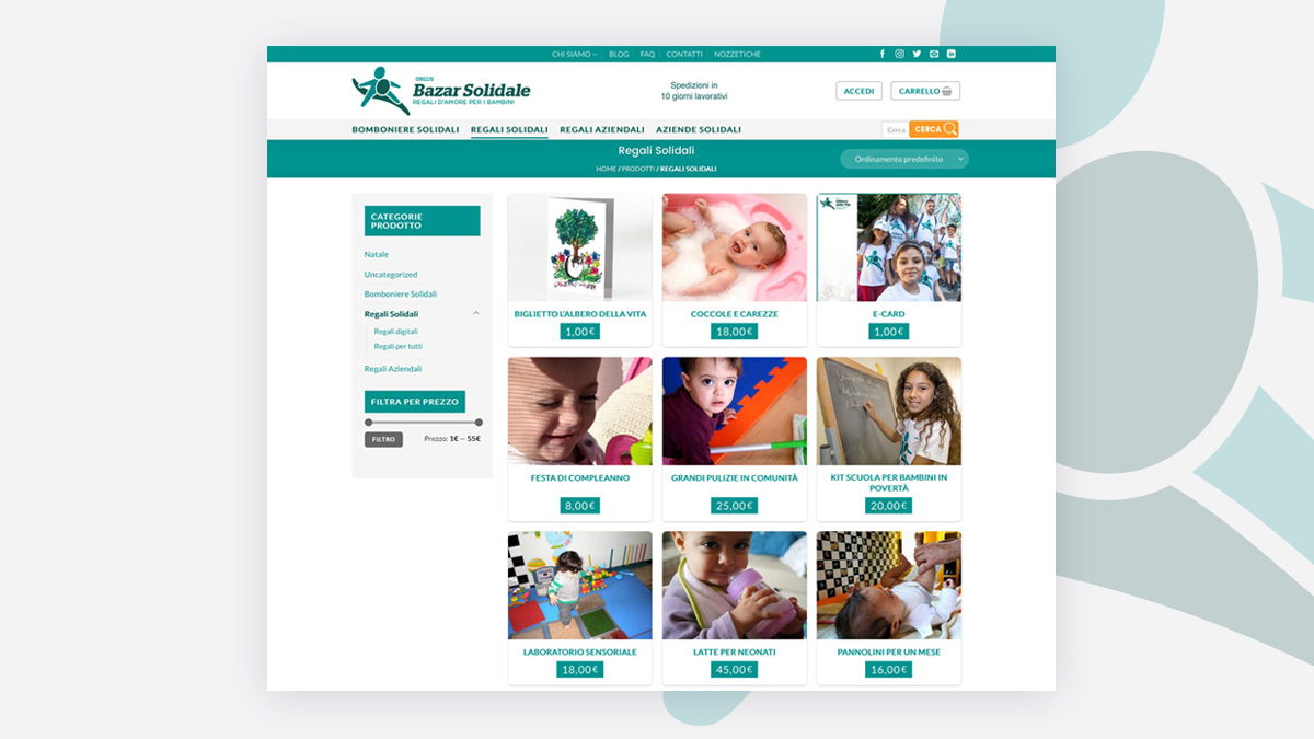 Progettazione grafica e sviluppo del sito web ecommerce della Onlus Bazar Solidale, che consente di fare donazioni e acquistare regali solidali.