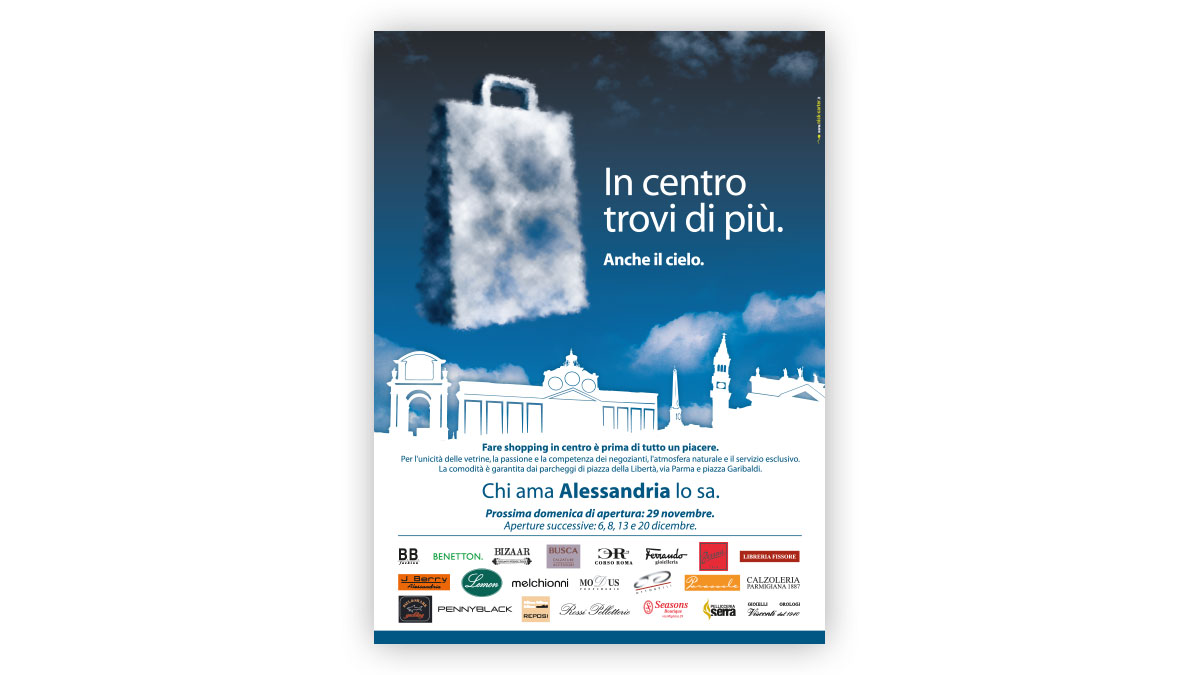 Ideazione e realizzazionedella campagna per le aperture domenicali dei negozianti del centro di Alessandria.